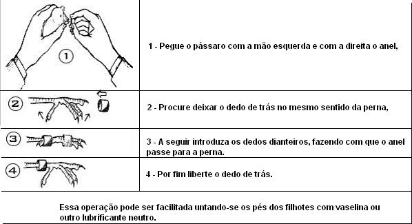 Nos Psitacídeos , não esquecer que ficam 2 dedos para trás e 2 para a frente, embora alguns criadores que é o meu caso apliquem o esquema anterior 1 para trás e 3 para a frente, as anilhas devem de ser metidas no 6º,7º ou 8º dia de vida conforme o desenvolvimento da Ave.